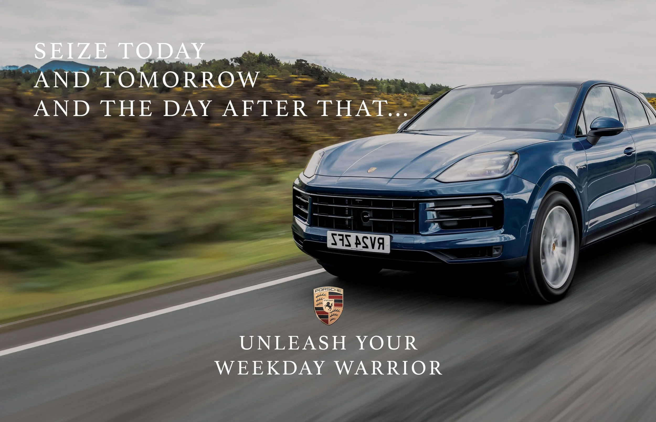 The ads call attention to Porsche’s everyday-luxury features and encourage readers to let the Cayenne “Unleash Your Weekday Warrior”.